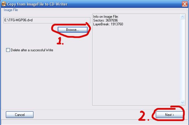 Write from image button3. On the next screen click "browse" and select the game.dvd file on you hard drive. Then click "Next" on the bottom right.