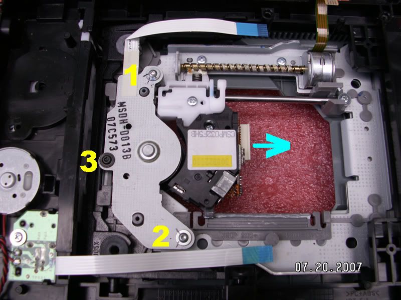 Mark one with a 'Y' and the other with and 'V' or whatever works best for ya, but do each one differently so ya know where that screw goes, and mark it all the way thru the head of the screw an onto the motor bracket some, so ya can tell which goes where as well as have that 'point of reference' to get back to. Best way to get it back as close to the default setting is after ya mark them snug them up the rest of the way, paying close attention to how many 1/4, 1/2 or full turns it goes past the markings until they are snug, then remove them, when ya put them back in place all ya have to do is snug them back down, then back them off the number of 1/4 turns or however far it was until you're back at the original position, where if all was done right it'll be lined up with your markings ya made. The center screw (number 3) doesn't have to be adjusted at all, it just comes out, then gets put back in place like any other screw. Slide the laser assembly back a little bit, just give it a gentle push, and then out the motor comes.