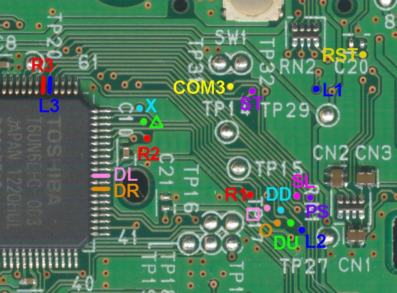 Here are the list of TP spots on the PS3 controllers, the most useful ones anyway, for anyone that would want to make up an Arcade Stick, add an extra button or something similar.