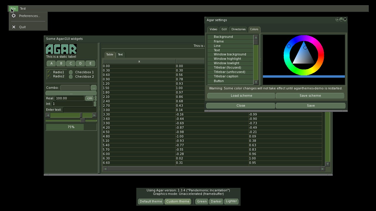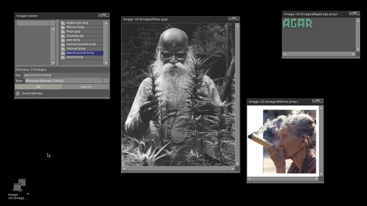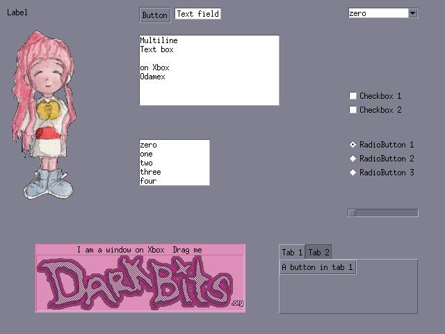 The library depends on the libSDLx, SDL_Image, and Freetype libraries all of which can be found in the SDLx svn repository on Huntsvegas. The file browser widget can load files from the D:\ path (the running games directory) but it cannot yet navigate around the file system. The controller is also not yet supported so a keyboard and mouse is needed. Those two things are the top priorities for completing the port. As it is you could receive the joystick input with SDL and make the warp mouse calls yourself to move the cursor around the screen. Agar can use hardware rendering through OpenGL but the Xbox port uses the sdlfb driver since OpenGL is unavailable.