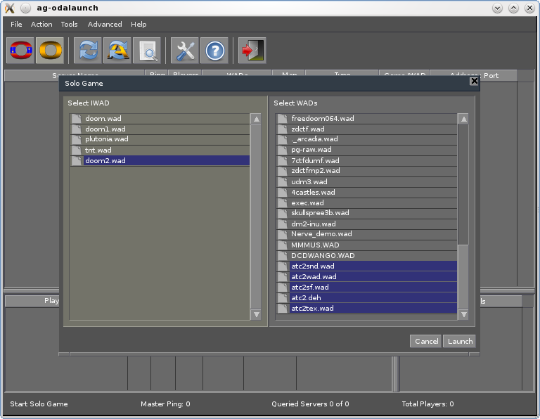You must make a selection in the iwad list before you can hit launch. You are not required to select a pwad. The pwad list allows multiple selections so you can load multiple wads like all the parts of the AliensTC or GoldenEyeTC or you could select a levels wad + skin wad, etc. This list includes dehacked patches. Currently wads are simply added to the list in the order they are read from the directory. They are unsorted and are not categorized. I would like to implement them into a tree list and sort them into alphabetized collapsible categories. That may be for the next version though For now you could easily add or remove wad directories in the settings dialog as you see fit so that your list doesn't contain too many at one time.