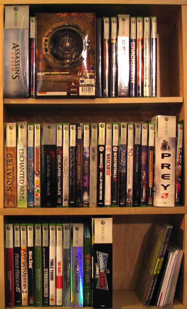 Bottom Shelf (left to right): Pocketbike Racer, Prey LE, PGR3, Rainbow Six Vegas LE, Ridge Racer 6, Samurai Warriors 2, Saints Row, Sneak King, Splinter Cell DA LE, R* Table Tennis, Tony Hawks Project 8, Viva Pinata, Smackdown Vs RAW 2007 LE.